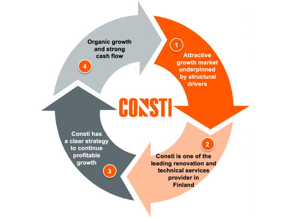 Consti is one of the leading companies focusing on renovation and technical building services in Finland. The company has a comprehensive service offering covering renovation and building technology services and selected new construction services to housing companies, corporations, investors and the public sector in Finland’s growth centres.