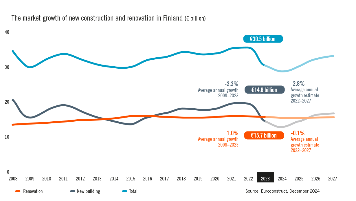 Renovation is needs-based and thus less sensitive to economic cycles than new construction. However, the steady growth of renovation over the past 20 years came to a halt in 2023, and the decline continued in 2024. In its September review, the Confederation of Finnish Construction Industries RT estimated that the development of renovation in 2024 was -4 percent. Euroconstruct's estimate, published in December, is -0.9 percent.
